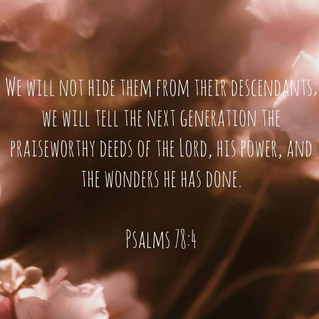 “We will not hide them from their descendants; we will tell the next generation the praiseworthy deeds of the Lord, His power, and the wonders He has done.” — Psalm 78:4