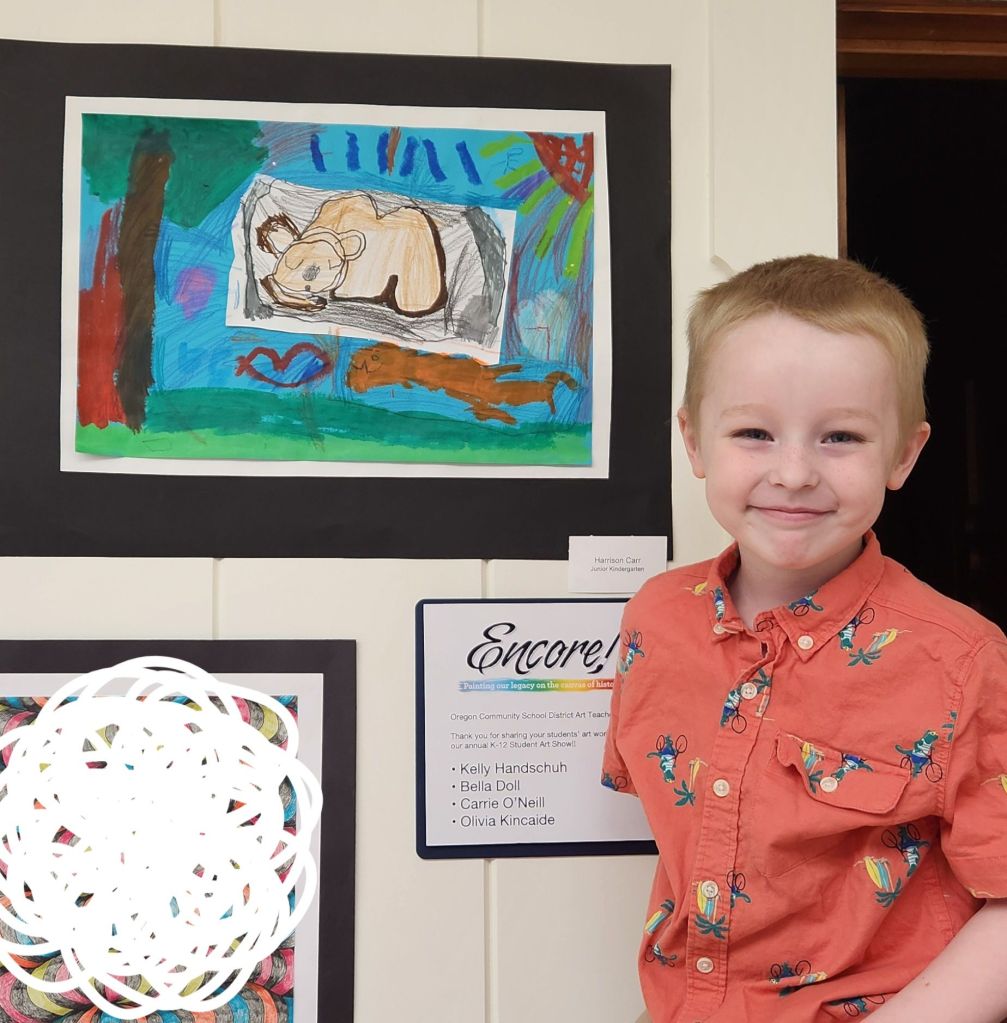 Last night, our family gathered at a little local gallery (Encore in Mt. Morris) to attend a very big event: an art show with a piece created by our grandson, Harry. He’s just five years old with an Aga who can’t draw stick figures, and yet, there it was: his very own piece, hanging proudly on the wall, part of a school exhibition that will run all summer long.